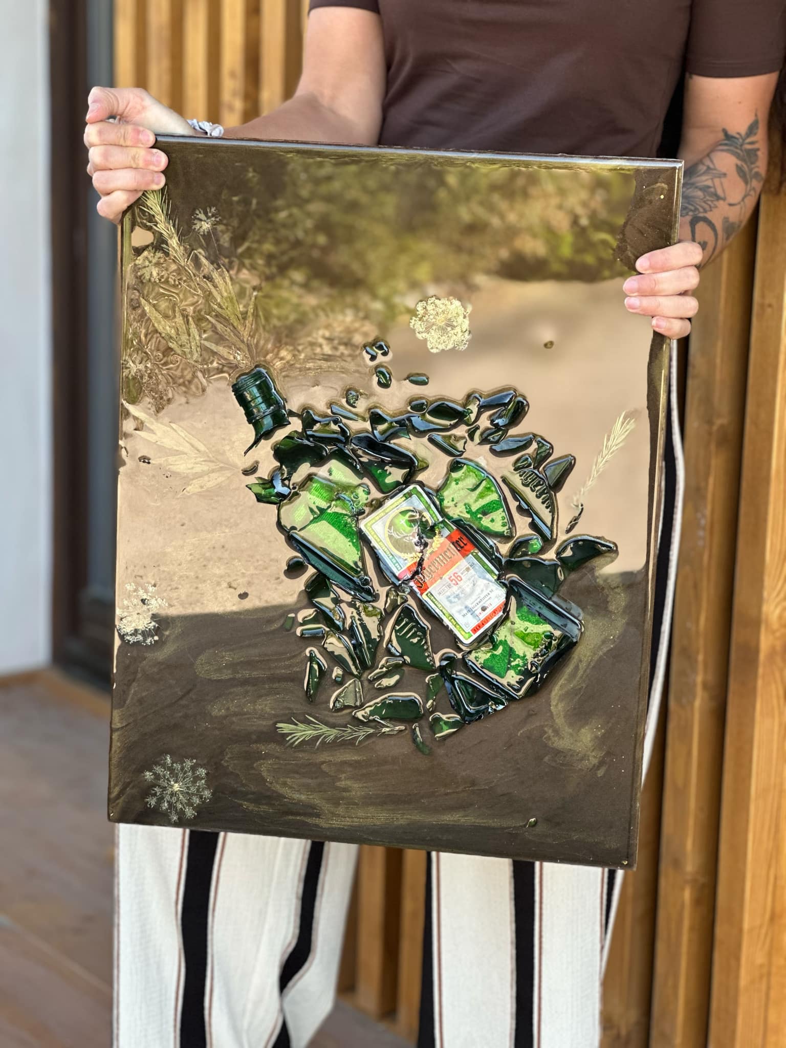 Dekor doplňují zaschlé květiny a metalický prášek, což vytváří syrový, přírodní kontrast k rozbité skleněné kompozici. Vhodné jako netradiční dekorace do interiéru, baru, kanceláře nebo jako stylový dárek.