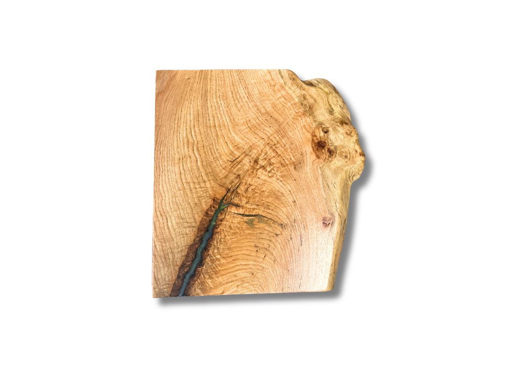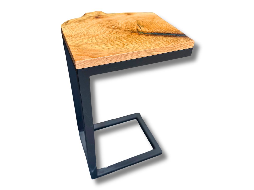 Originální ručně vyráběný dubový stolek z masivního dřeva s černou kovovou konstrukcí. Přírodní prasklina v desce je vylitá modrozeleným epoxidem, který pod různým světlem vytváří nádherný efekt hloubky. Každý kus je naprostý originál – kresba dřeva i tvar praskliny jsou jedinečné.