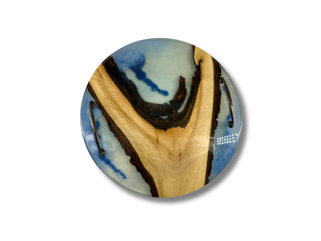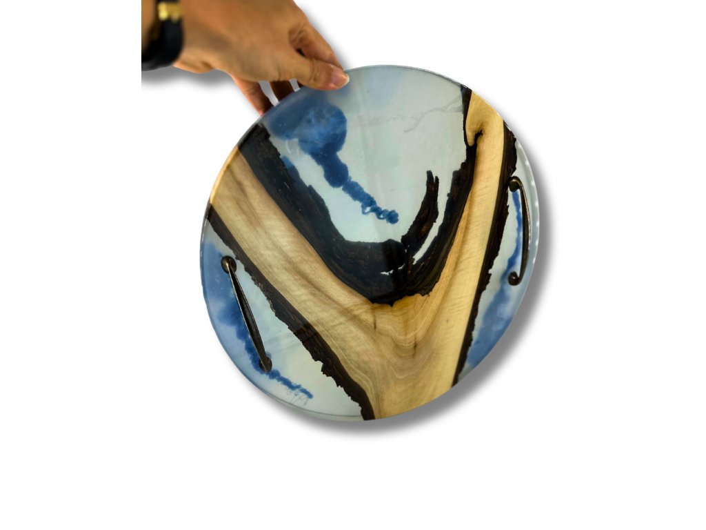 Unikátní ručně vyrobený podnos, který propojuje krásu přírodního dřeva a elegantní transparentní epoxidové pryskyřice. Tento kousek nese název Lightness – a není to náhoda. Jeho světlá, jemně modrá pryskyřice evokuje lehkost oblohy a kontrastuje s tmavými linkami ořechového dřeva, čímž vytváří vizuálně vyváženou kompozici.