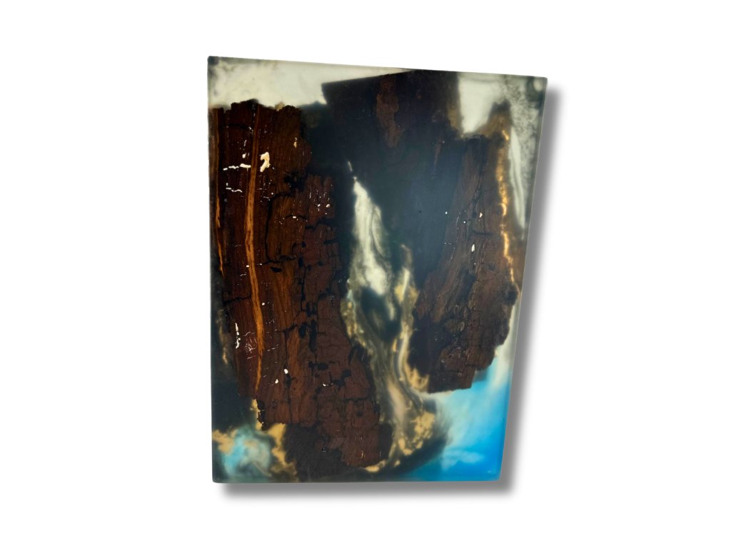 Originální, masivní epoxidový podnos, kde dominuje nejen rozpraskaná a atypická třešeň, ale také modré odstíny v kombinaci se zlatou a celý podnos je doplněn čirým epoxidem, díky kterému získal 3D efekt.
