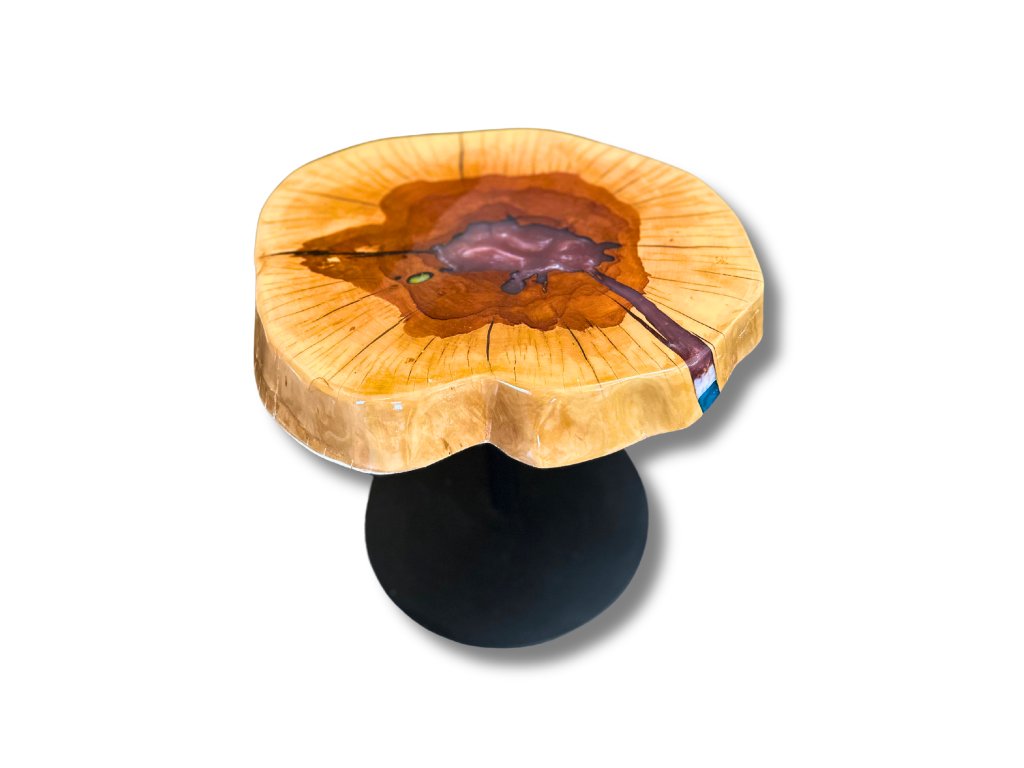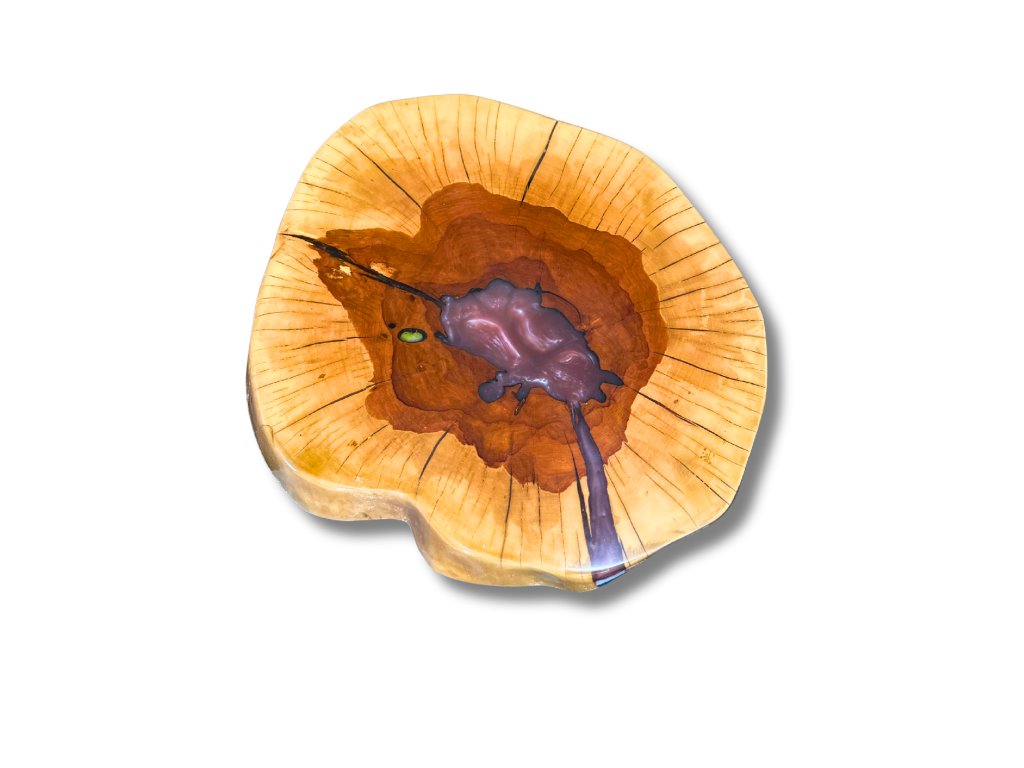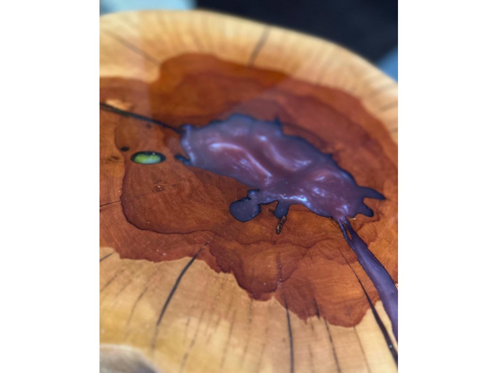 Stůl „Violin“ je originálním spojením přírody a moderního designu. Masivní koláč s přirozenou prasklinou byl zachován ve své autentické podobě a zalit epoxidovou pryskyřicí vínové barvy. Leštěn do vysokého lesku.
