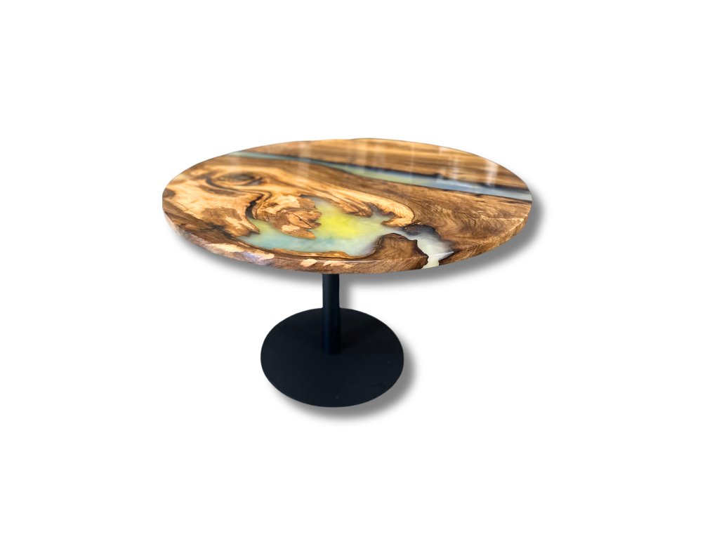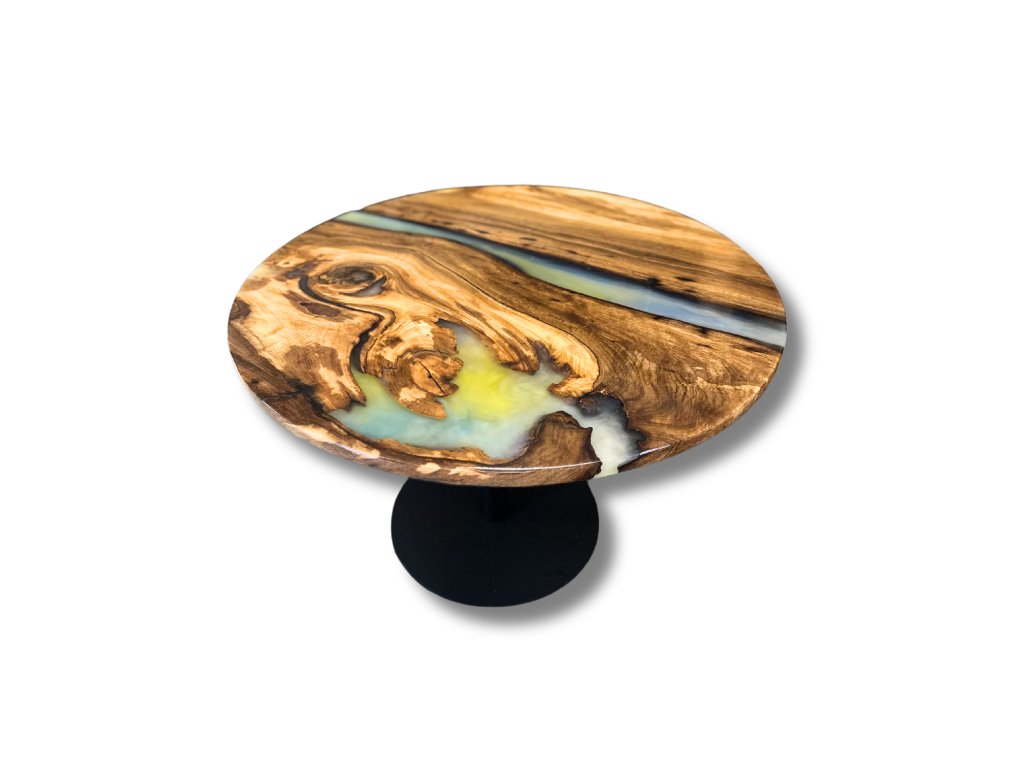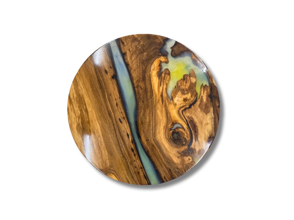 Originální stolová deska z masivního ořechového dřeva, kterou doplňuje epoxid v tónech zelené a modré. Kombinace teplého ořechového odstínu a výrazných barev pryskyřice vytváří jedinečný kontrast, který působí elegantně i svěže.